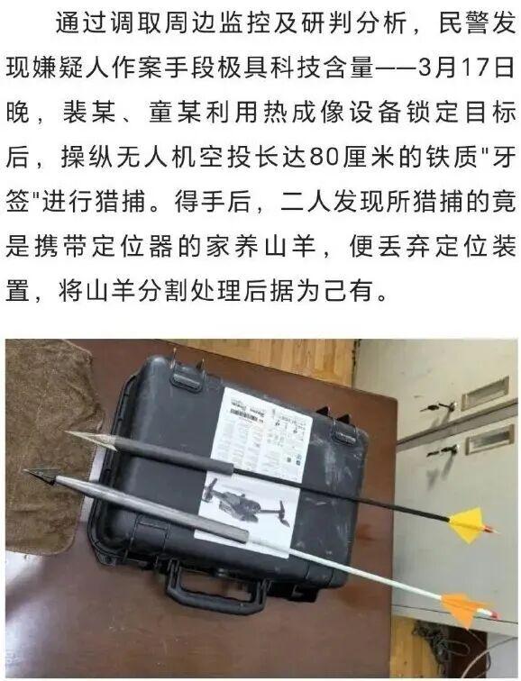 一根钢钎能准确地丢下来打穿野猪的头,那它就能打穿其他动物的头。4 月 18 日赫山公安报道,有人使用热成像设备和无人机坠箭打死了养殖户的山羊,"得手后,二人发现所猎捕的竟是携带定位器的家养山羊"。这里的用词特别值得揣摩:"竟是"?那么他们本来准备猎捕的是什么?