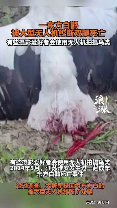 去年 5 月,江苏淮安有人用无人机违规航拍,螺旋桨绞断一只东方白鹳(国家一级保护动物)的双腿致其死亡。