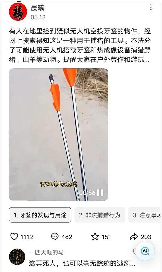 首先,犯罪嫌疑人非法猎捕野生动物的手段之一是无人机坠箭,这是一种大多数人闻所未闻,但在国内狩猎"圈子"里已经相当出名的狩猎方法,黑话称为"牙签"。用无人机红外热成像找到动物,然后扔下钢箭,利用重力加速度把动物刺死。
