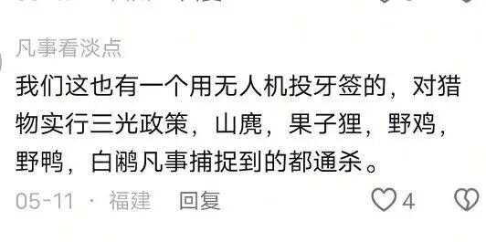 无人机坠箭可以杀野猪、家畜,也就可以杀死大熊猫、藏羚羊、东北虎……当然,无论使用什么工具,捕杀保护动物,或在禁猎区、禁猎期打猎都是违法的。但盗猎本身就极具隐蔽性,很多案件的线索都出现于销售端,而一旦动物成了"货物",对于生态保护来说往往意味着"为时已晚"。原本的电网、兽夹、猎套已经让盗猎防不胜防了,如今再增加一种革命级的、买卖完全无限制狩猎工具,绝不会是什么好事。