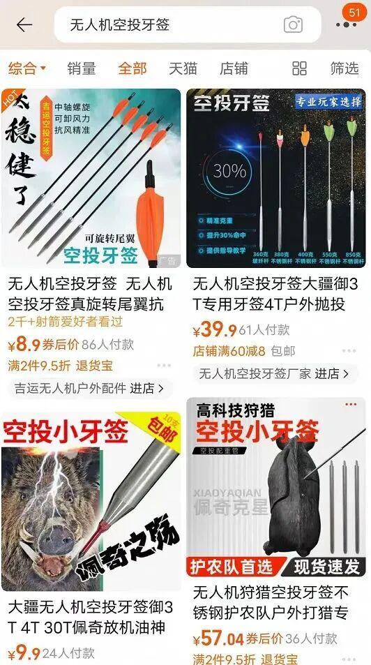 而与此同时则是实行无人机坠箭猎杀的装备,在网上随意流通,几乎没有限制。淘宝上随手一搜"无人机 坠箭","无人机 杀野猪",这样具有巨大破坏力,甚至可以称之为"武器"的工具唾手可得,而且售价相对不高。卖家甚至都"懒得"像出售圈套等非法猎具一样,用个"暗语"。