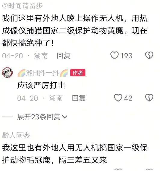 实际上已经有不少人表示,已经存在许多使用无人机捕猎"三有"和国家一级、二级保护动物的不法行为,无人机让不法分子的活动变得更加肆无忌惮,其危害性是巨大的。
