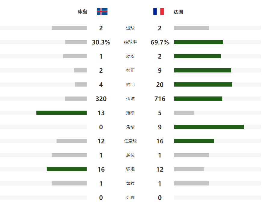 第36分钟奥利塞主罚的右侧定位球直奔球门而去,被冰岛门将挡出底线,3分钟之后,不被看好的冰岛,率先取得了比分上的领先,左侧任意球造成法国门前混乱,帕尔松补射建功,将比分改写为了1-0,半场结束前,奥利塞非常有威胁头球,又一次被状态神勇的冰岛门神扑出。