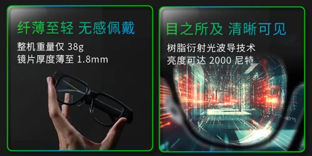 据介绍,这款眼镜采用轻量化设计,整机重量 38 克,镜片厚度薄至 1.8mm,号称“不压迫耳鼻”,内置树脂衍射光波导技术屏幕,亮度可达 2000 尼特,眼动观看范围(Eye box)是 15*11mm,可在行走中带来更稳定的使用体验。