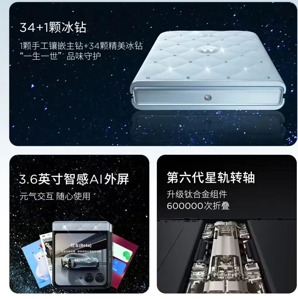 其中,手机为moto razr 60施华洛世奇冰钻限定版,背板采用素皮基底镶嵌水晶工艺,核心搭载联发科天玑7400X处理器,前置3200万像素,后置5000万像素道正网,电池是4500mAh,支持33W快充、15W无线充电。