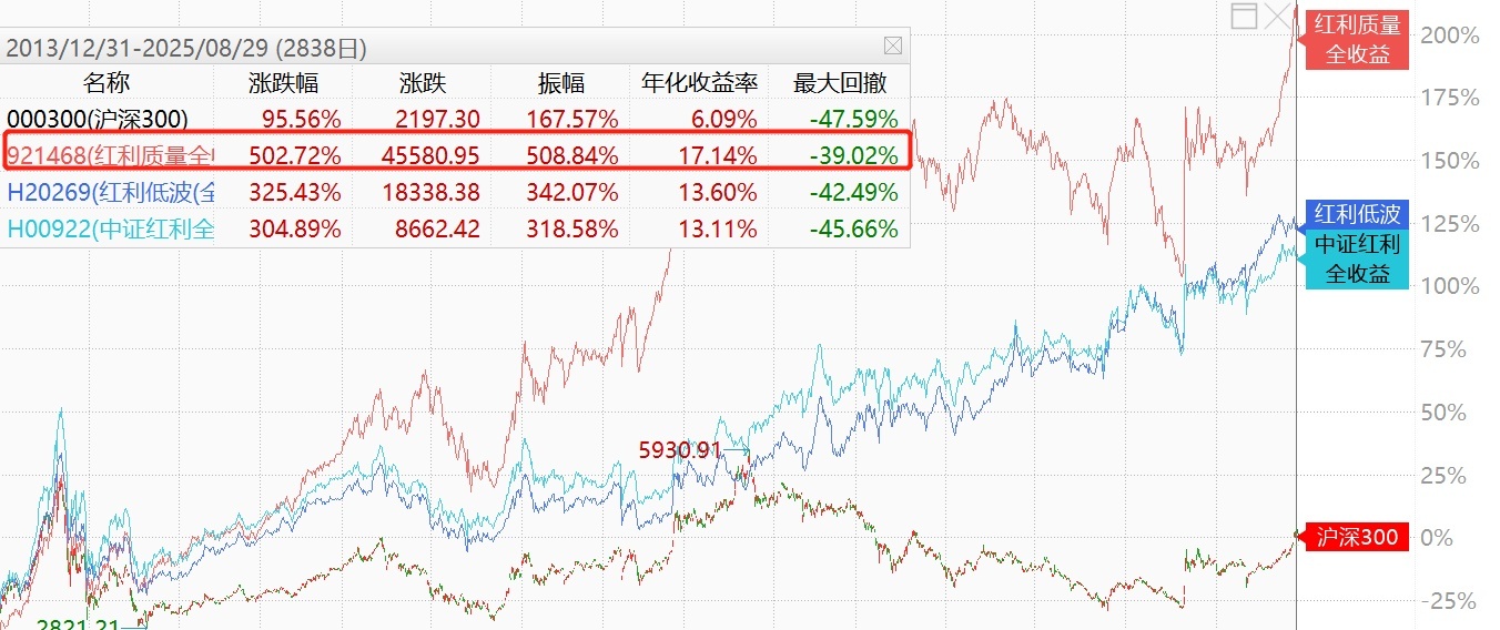 与传统高股息策略不同,中证全指红利质量指数采用独特的“红利+质量”双因子筛选机制,聚焦既具备低估值特征、又拥有高质量基本面的优质企业。截至2025年8月29日,该指数的全收益版本自基期以来累计涨幅达502.27%,显著高于同期红利低波全收益指数(325.43%)和中证红利全收益指数(304.89%)的表现。