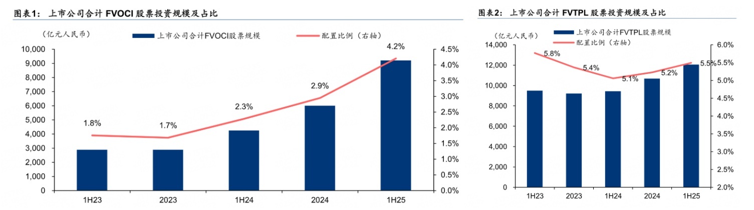 据统计2025年上半年,7家上市保险公司显著增加了高息股的配置。其中,计入“FVOCI”(以公允价值计量且其变动计入其他综合收益)类别的股票平均配置比例较年初提升1.3个百分点,达到4.2%,增配规模约0.32万亿元。同时,计入“FVTPL”(以公允价值计量且其变动计入当期损益)的股票配置比例也出现小幅上升。