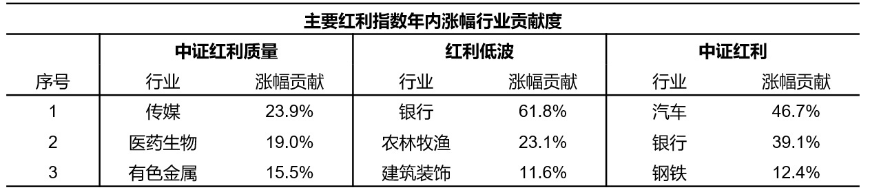 解构收益来源,据Wind数据显示,今年银行股在传统红利指数中占据了绝对主导地位,贡献了红利低波指数62%的涨幅及中证红利指数近40%的涨幅。中证红利质量指数的收益结构更多元,其年内涨幅主要得益于传媒、医药生物等成长板块的驱动。