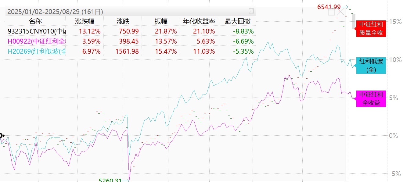 从相关红利指数表现来看,目前市场主流包括中证红利指数、红利低波指数、红利质量指数等,尽管都指向高股息资产,但底层资产分布和表现有所不同。截至8月底,中证红利质量全收益指数年内涨13.12%,同期中证红利全收益指数、红利低波全收益指数涨3.59%、6.97%。
